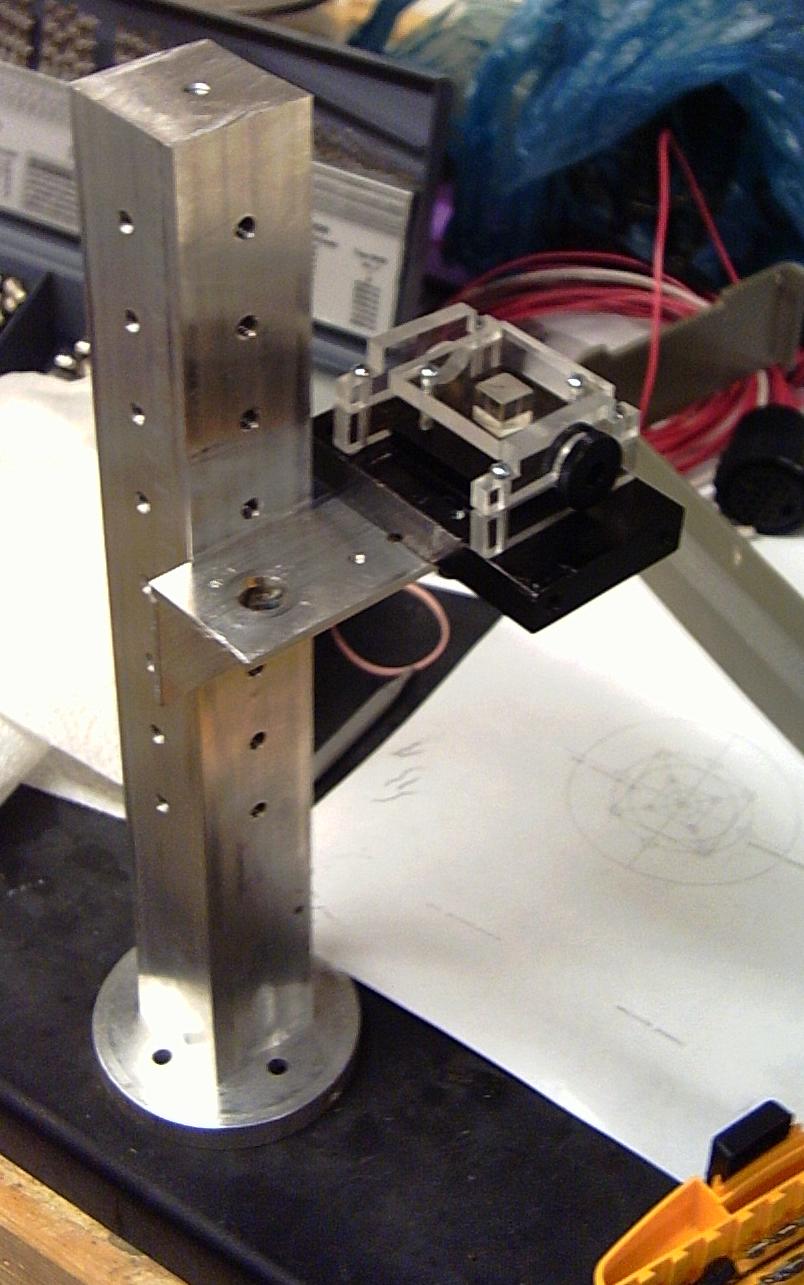 I completely re-did the mount for my big collimating lens. This one has vertical square tubes, replacing the old one's vertical #8 threaded rods, and two parallel pieces of 1 1/2 inch angle for a wider base, and is significantly more rigid. There is thick (foam) double sided tape on the top edge of the lens, which is then pinched by the mount, to hold the lens.