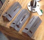 The beam splitter itself is on a 1 1/2 inch angle out-rigger. I have four of these arms, fabricated in my friend's milling machine. One slot allows the arm to move vertically along the post (optical Y axis), and the other slot allows the beam splitter (which has a #8 screw on the bottom) to slide closer and away from the post (optical X axis).