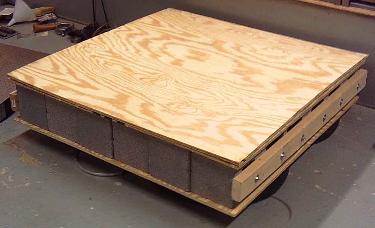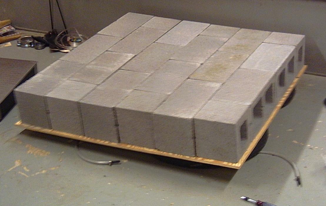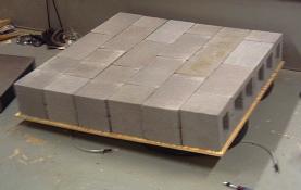 The cinder blocks are not cemented or glued together. Then I would never be able to move it... They are instead held together with two 2x4's, and threaded rod. The threaded rod is under significant tension, the final assembly is quite rigid. Standing on it is extremely strange, its solid yet wobbly from the inner tubes.