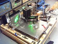 The assembly on the breadboard in the picture is an interferometer, with a bunch of extra stuff (like the big lens) which didn't have anywhere better to go. The first theory was to try to hang steering mirrors off the edges of the breadboard, similar to how the small lens on the far left is on an "out rigger", and save active breadboard area for more interesting stuff. Unfortunately that was nowhere near stable enough. I tried a couple of different designs. An aluminum angle out-rigger can be seen sitting on the edge of the plywood on the far left. None were rigid enough, and I finally went with the mirror mount seen in the next image.