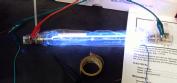 The final observation is that this power supply will reliably simmer up to six inches of arc. Two 4 inch lamps are too long, and two 6 inch lamps are right out (the one in the picture is a 6 inch lamp with an about 18mm bore). This observation is supported by noting the data sheet says its good for 300 volts (1500 open circuit), and that the arc lamps need at least a volt per mm of arc length. (See Heraeus Noblelight's Lamp Book, there is a graph of simmer volts/mm vs current on page 21. (my lamps are 5mm bore, which implies 200 to 300ma of current, see fig 32 on page 20.).)