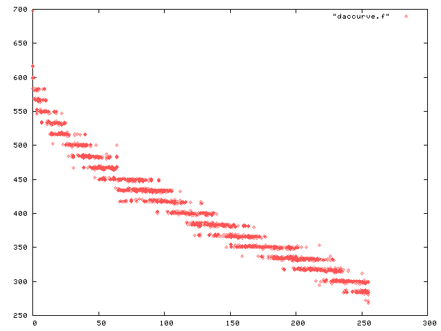 X is the value given to the DAC. Y is the time of a cycle in milliseconds. The target speed is 400 ms. There are 10 samples per DAC value. Observe the banding...