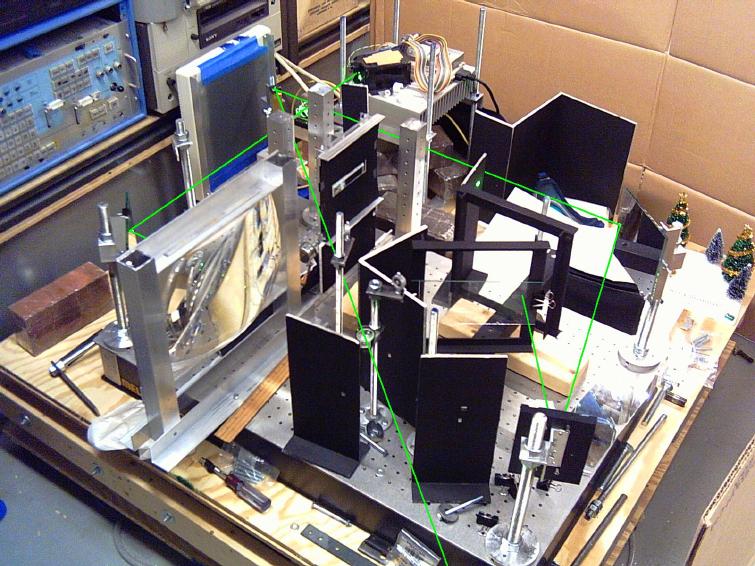 The beam splitter itself is behind a post (the uppermost one). Then one arm goes off the mirror on the left corner, which bounces the beam off the flat surface of the big collimating lens. The other arm goes off the steering mirrors on the top right and bottom right corners, and then bounces the beam off a piece of glass clipped to my H1H2 frame (see version 2.2). The arms then recombine at the beam splitter, bounce off a steering mirror to the left of the beam splitter, and go through a lens way at the bottom. (There are quite a few un-used optics on the table.)