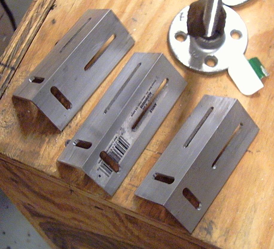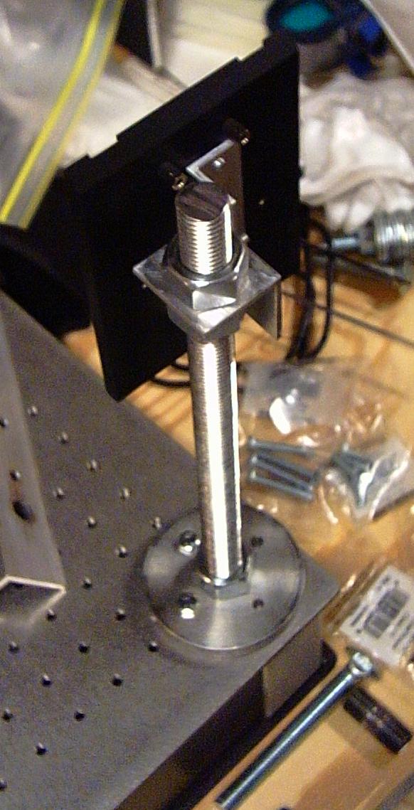 The beam splitter itself is on a 1 1/2 inch angle out-rigger. I have four of these arms, fabricated in my friend's milling machine. One slot allows the arm to move vertically along the post (optical Y axis), and the other slot allows the beam splitter (which has a #8 screw on the bottom) to slide closer and away from the post (optical X axis).