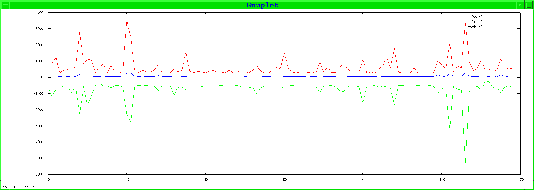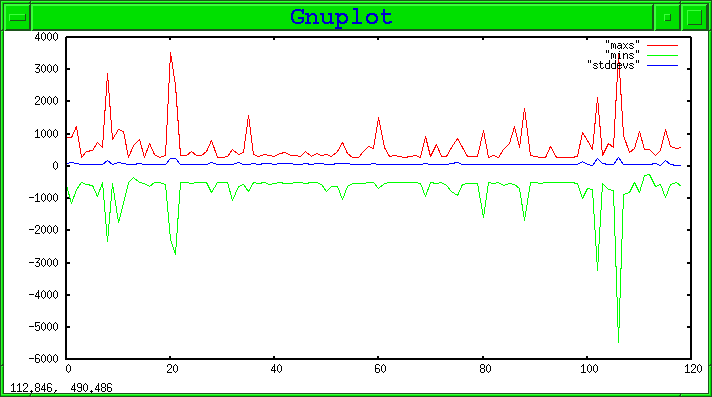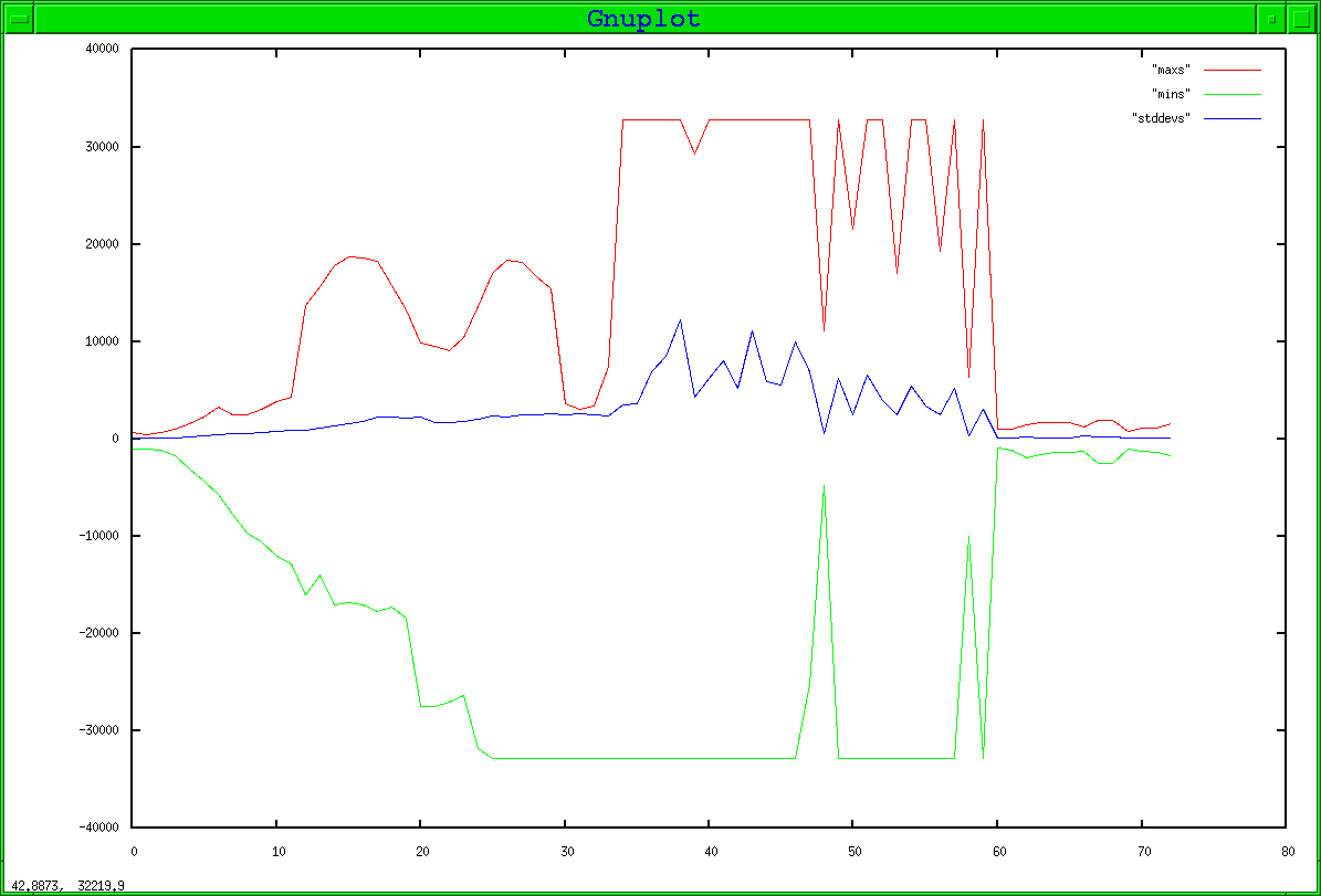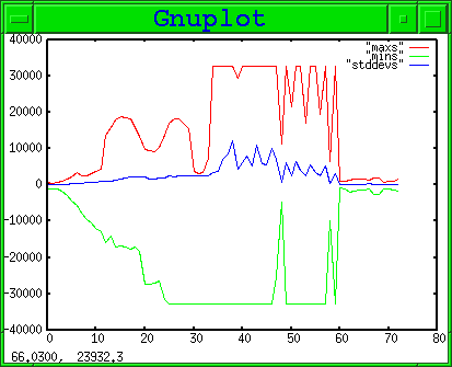 I then had the laser do its calibration dance. I got 73 events in 511 seconds. I then observed the distribution of samples for each event. X is event number, Y is sample value, or standard deviation.