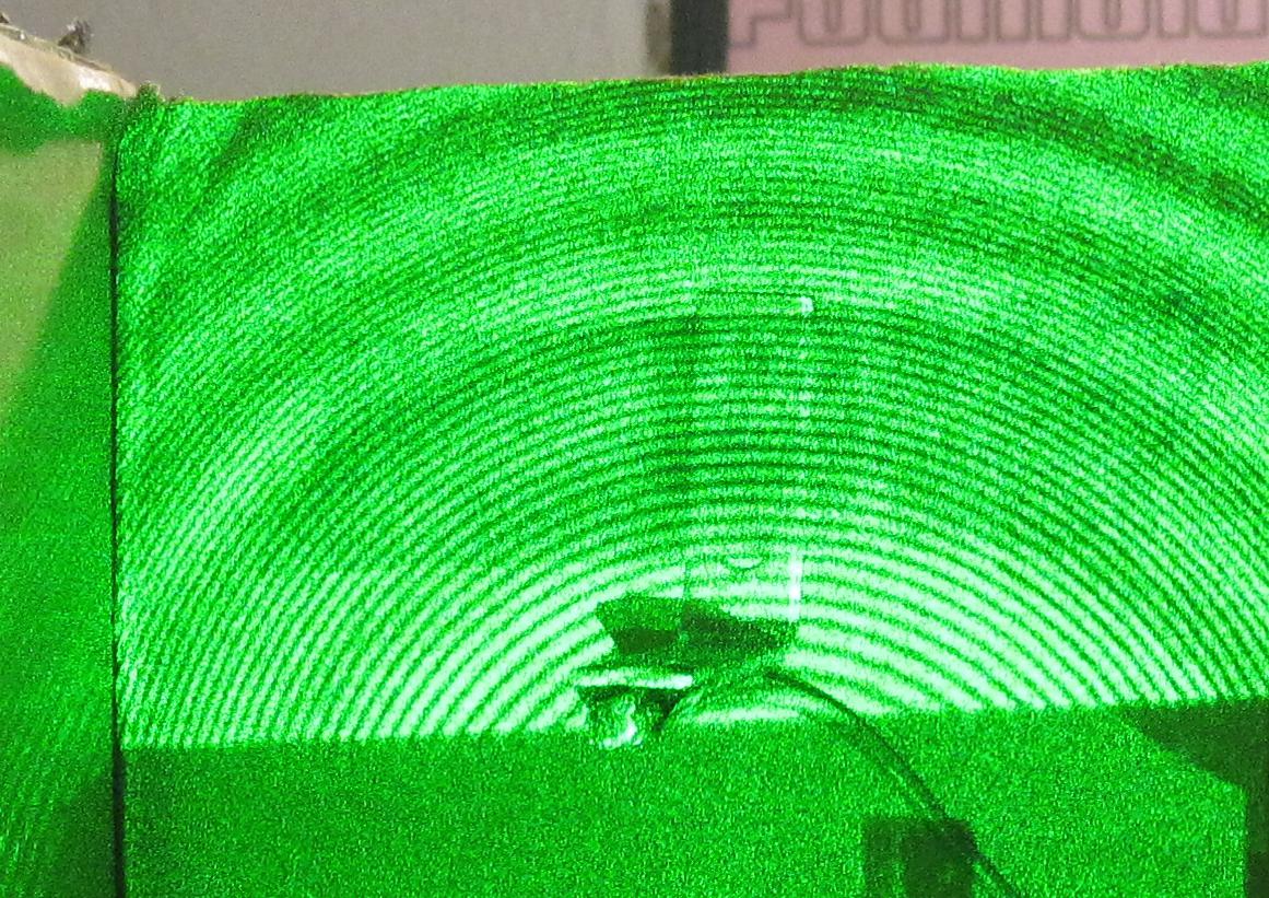 This picture shows the photo transistor (taped to an angle bracket, in turn taped to a baffle), and the interference pattern its observing. Note that the camera is having some moire pattern issues with the rings.