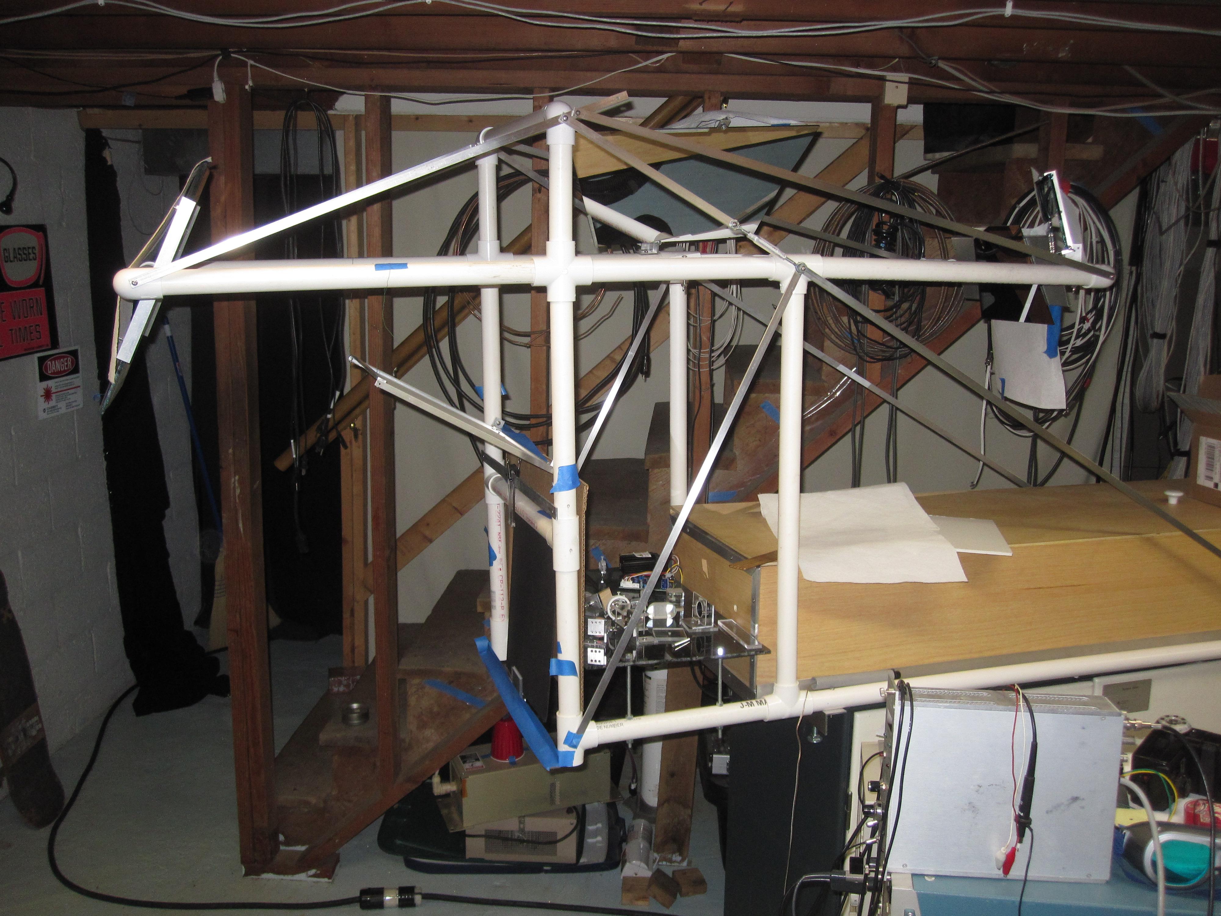 Most of the optics are on a piece of plexiglass directly in front of the laser. The laser comes out of the box, goes through a half wave plate, and then hits a prism. The prism is the beam splitter for the reference beam. The main beam continues to the left, while the reference beam goes through a diverging lens (in the white plastic holder) and then a steering mirror which bounces it to one of the large mirrors on the PVC gantry.