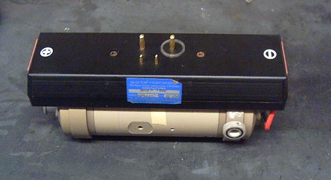 The flow tubes have a square outside cross section, with a round inside for the lamp or rod. The row of three flow tubes is then placed in the center of a cylinder which is filled with a rubbery material. The ends of the rubbery material are opaque white. We theorize that the middle is clear, for a large white reflecting chamber, but it may be opaque white the whole way through.