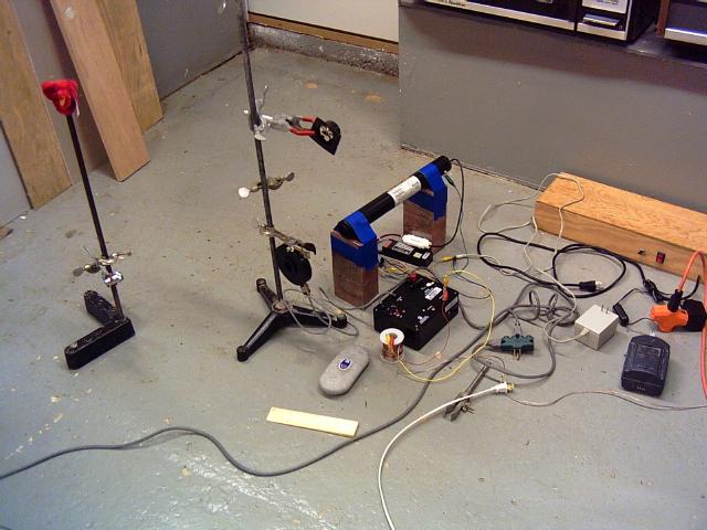 The holography rig consists of a piece of plywood (actually an old shipping crate lid, hence the "Eye Tracker" stencil), balanced on four pieces of closed cell foam from a computer shipping box. (The eye tracker itself was a thing to behold...)